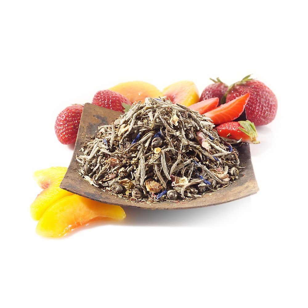Ingredients: Silver Needle white tea, Jasmine Dragon Phoenix Pearls green tea, green rooibos, citrus peels, red rooibos, candied papaya pieces (papaya, sugar), peach pieces, strawberry pieces, rosebuds, natural and artificial flavoring, rhubarb pieces, and marigold petals.