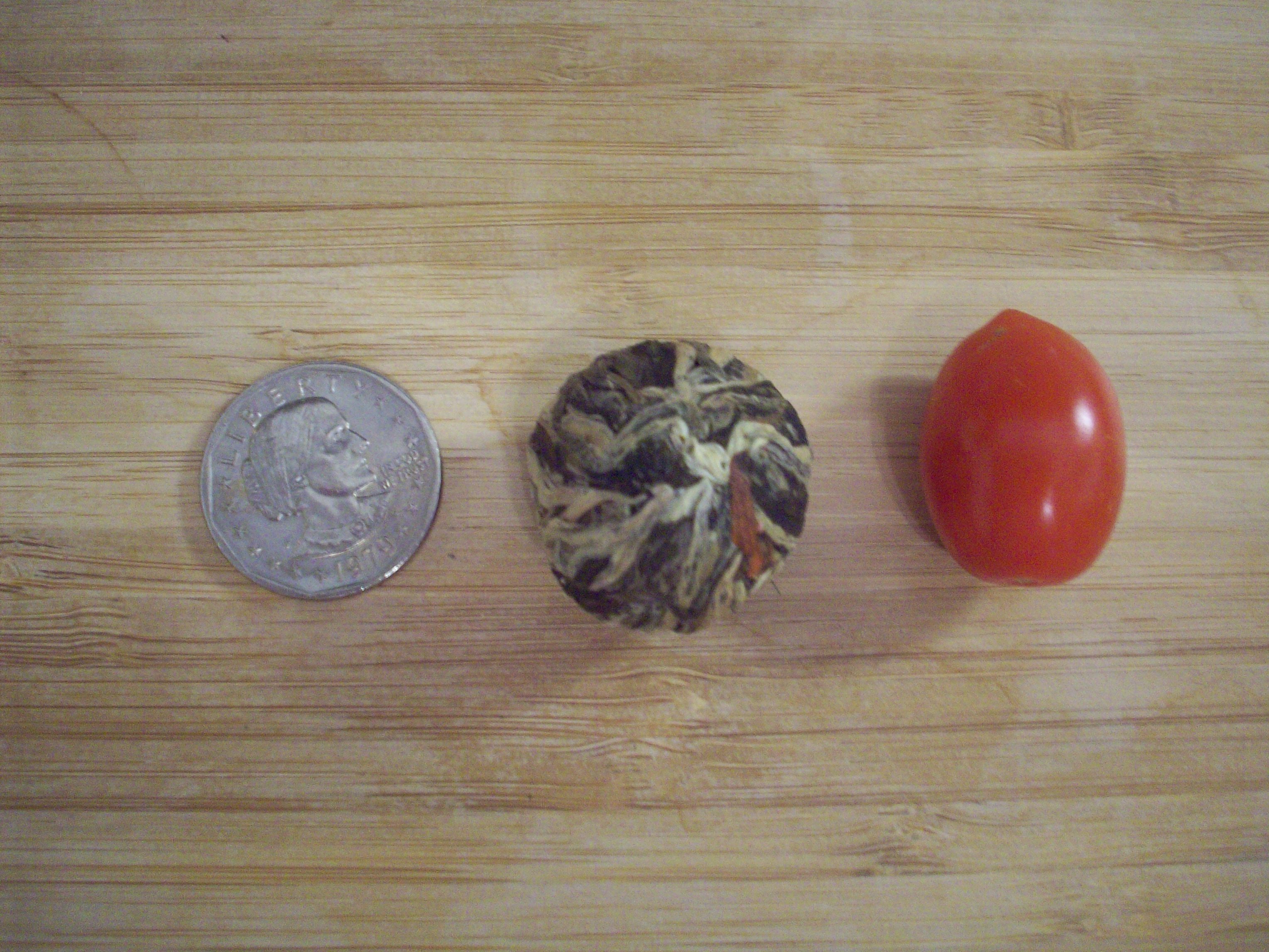 Size comparison, from left to right: a quarter, a Oriental Beauty tea ball, and a grape tomato / Photo courtesy of Sara Letourneau